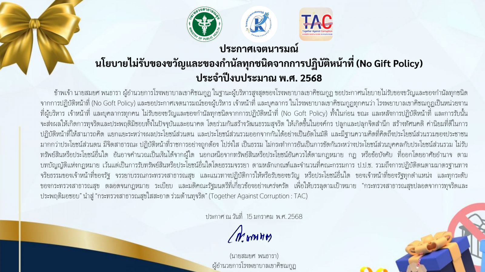 2566/01/26 ของดรับของขวัญ ของกำนัลใดๆ มาตรการการงดให้ หรือรับของขวัญ หรือประโยชน์อื่นใด (No Gift Policy). ในการดำเนินงานและเทศกาลสำคัญ |