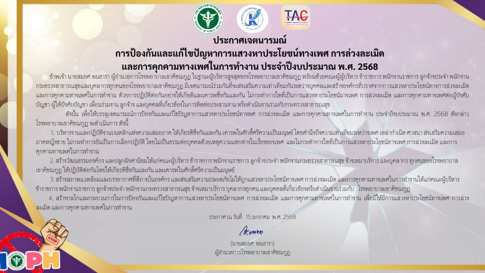 2568/06/04 ประกาศเจตนารมณ์ การป้องกันและแก้ไขปัญหาการแสวงหาประโยชน์ทางเพศ การล่วงละเมิดและการคุกคามทางเพศในการทำงาน ประจำปีงบประมาณ พ.ศ. 2568 โรงพยาบาลเขาคิชฌกูฏ ขอประกาศเจตนารมณ์ การป้องกันและแก้ไขปัญหาการแสวงหาประโยชน์ทางเพศ การล่วงละเมิดและการคุกคามทางเพศในการทำงาน ประจำปีงบประมาณ พ.ศ. 2568 |
