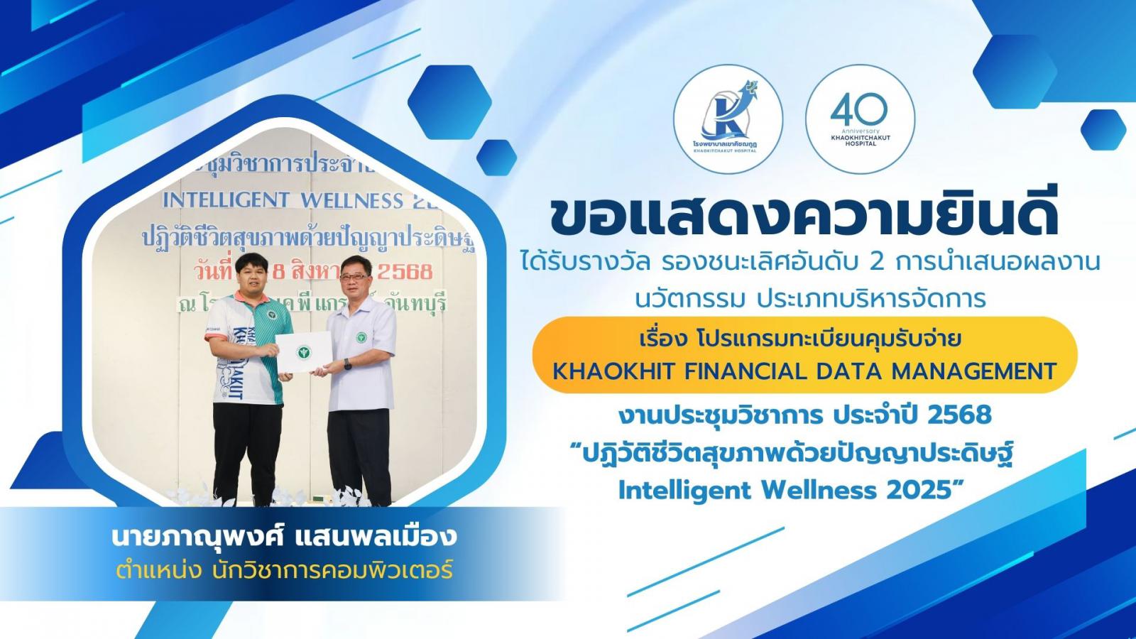 2568/08/14 ขอแสดงความยินดี ได้รับรางวัล รองชนะเลิศอันดับ 2 การนำเสนอผลงาน นวัตกรรม ประเภทบริหารจัดการ เรื่อง โปรแกรมทะเบียนคุมรับจ่าย KHAOKHIT FINANCIAL DATA MANAGEMENT งานประชุมวิชาการ ประจำปี 2568 "ปฏิวัติชีวิตสุขภาพด้วยปัญญาประดิษฐ์ Intelligent Wellness 2025" |